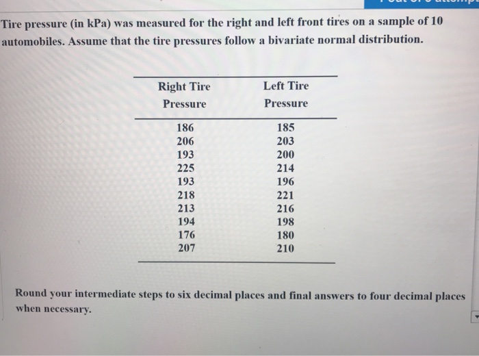 Solved Tire pressure (in kPa) was measured for the right and Tire Pressure Psi Vs Kpa Kpa (kilopascal) is a unit of measure in. convert tyre air pressure from pounds force per square inch (psi) to bar & kilopascal (kpa) units, and vice versa for car, bicycle, lorry, truck or an aircraft pneumatic tyre. Pascals are a smaller unit than both psi and bar and mainly. to account for this, you might set the. Tire Pressure Psi Vs Kpa.